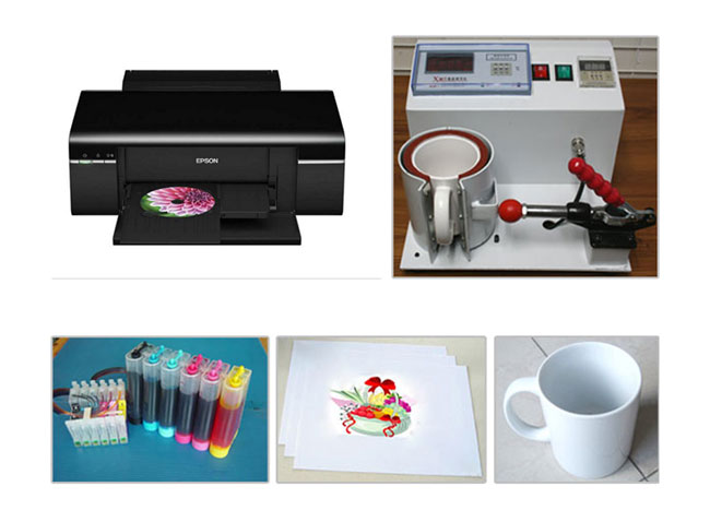 To accomplish the mug transferring, you need to have a piezoelectric printer (like Epson R330), ink cartridge (ink), heat transfer machine, A3 or A4 sublimation paper (rolled paper is also available for different printers) and blank mugs.