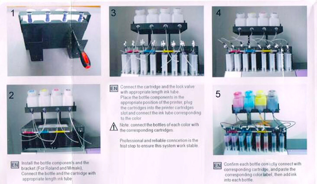3. A bottle unit is installed on the top of a printer. And each bottle is connected to each catridge with ink tubing.