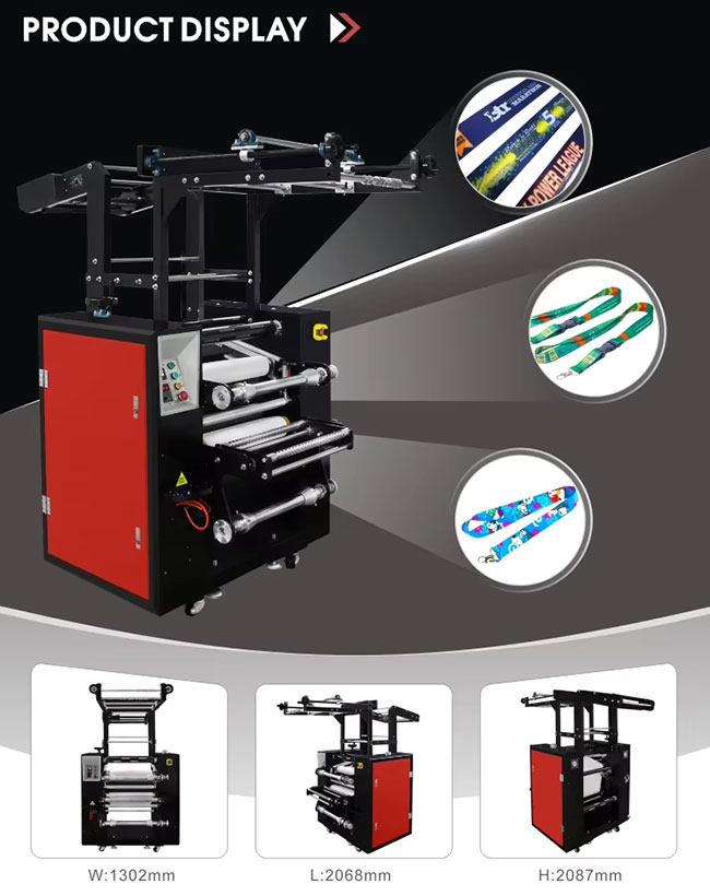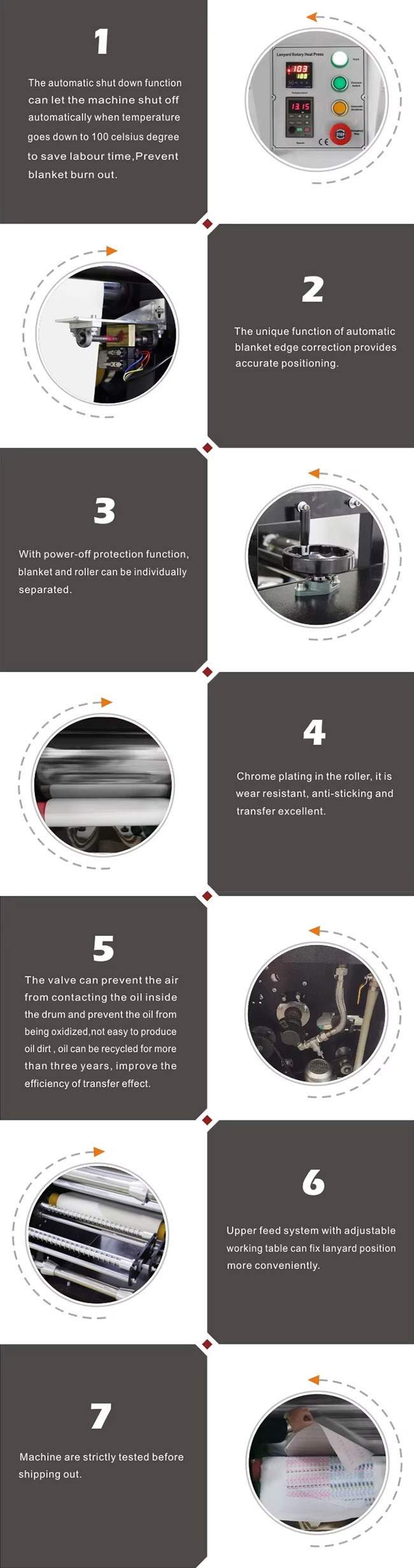 The product can be applied to one side or double-sided printing fabric, such as: ribbon ,lace,mobile phone lanyard . With stable heating temperature ,the effects of finished products havegood and clear printings by its accurate positioning according the different requirements,what s more, it can transfer several fabric at thesame time in order to improve the productionefficiency.