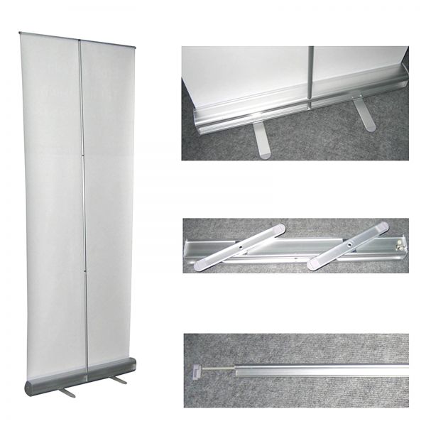 This roll up display stand, also known as a retractable banner system, is ready to set up almost immediately. Just flip out the feet, raise the pole, and lift the banner. This roll up display stand automatically rolls the banner into `the` base for storage and transportation.